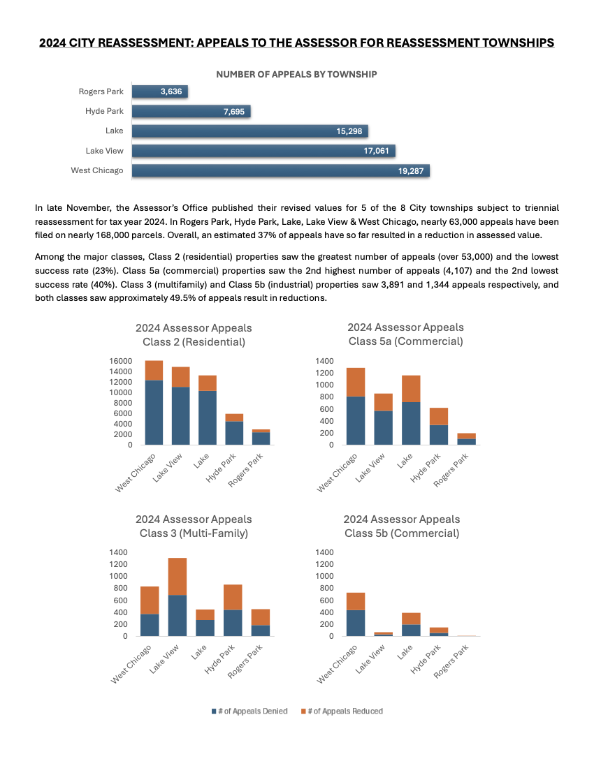 The Lake View Township 2024 initial assessments were released on July 2, 2024 and the deadline to file an appeal is August 14, 2024. Other upcoming appeal deadlines include: Hyde Park, opening in late July; and Lake, opening in late August. Dates for North Chicago and South Chicago have not been determined.